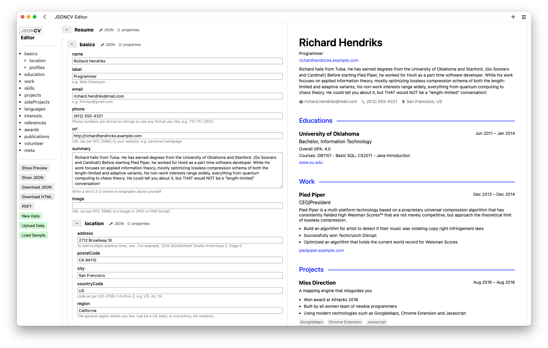 It is recommended to write your CV throught the online Editor. However, if you are familiar with JSON, you can also maintain the data file in a text editor locally.